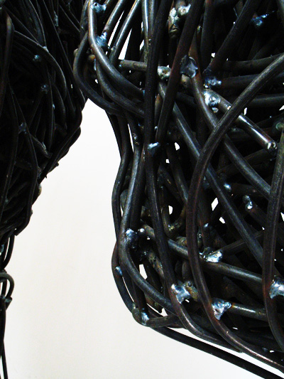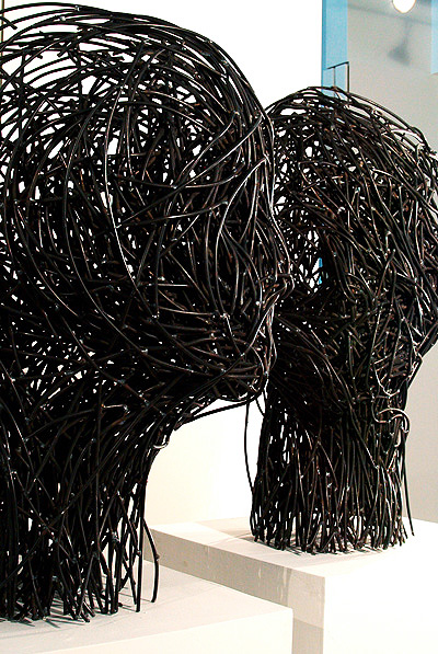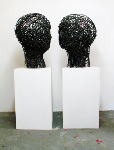 #1 & #2 of Head Series, 2006 They were the first of the head series (2006). The heads were created with a mass of woven lines, coming together to create a defined form. The head form came from a desire to establish the intimate space 2 people create when together. The scale and the pedestals were used to play with how one looks to another, a child to a parent. There is no gender but people often see women. The space they are in is not defined (as far as what is happening between them, or what is being communicated).