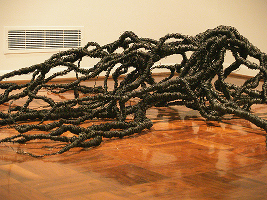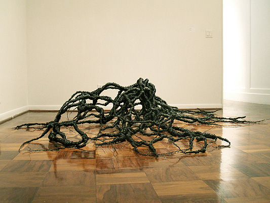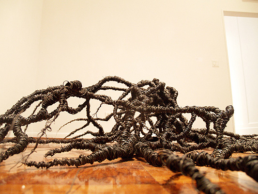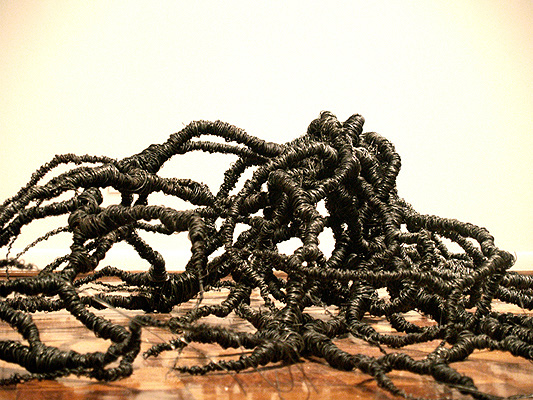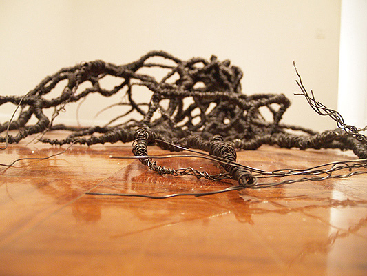 The sculpture is situated in between material manipulation of the cumbersome industrial tie wire and the delicate touch the tentacles have on the surface where it rests.