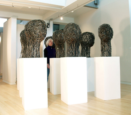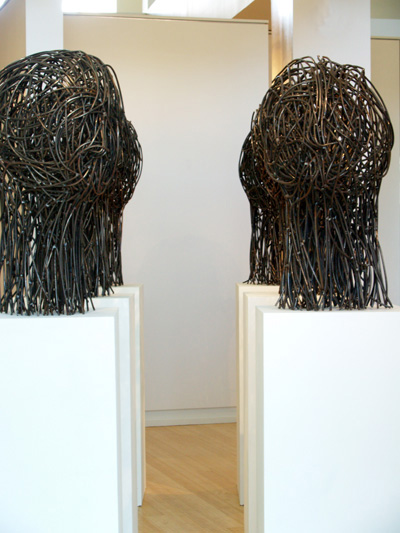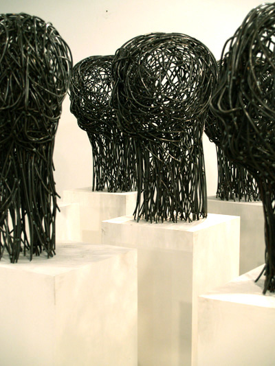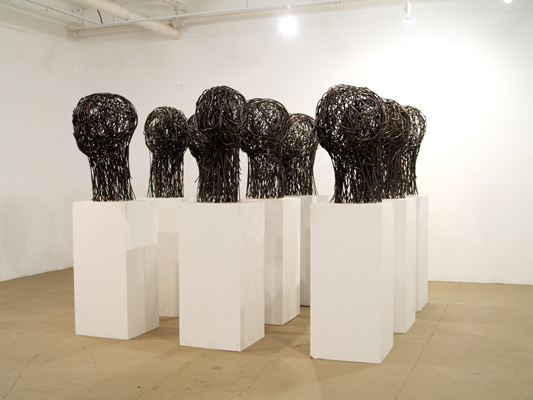 Unit. 2007 9 Heads on 9 pedestals in a grid approximately 108” square. The space is just large enough for people to walk amongst the heads. The unit is a group, an army, a family, a gang, a fraternity, a team…when together the individual becomes second to the unit, ideas, decisions, morals, character, etc. are all influenced by the unit, the one. There is chaos and order; the heads are composed of a mass of steel lines, all created individually; the pedestals are all the same. The heads remain individual while the space they reside becomes the same. The shifts between the individual verses the Unit vary. There is peace amongst the heads, there is anonymity, and there is tension and confrontation…