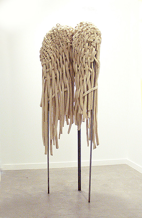 Wings Death Feather Fly Felt is heavy and absorbs sound, smell, taste & color It contains history Shape of a feather Shape of a back-pack 2012, Felt, approximately 52"x40"12"
